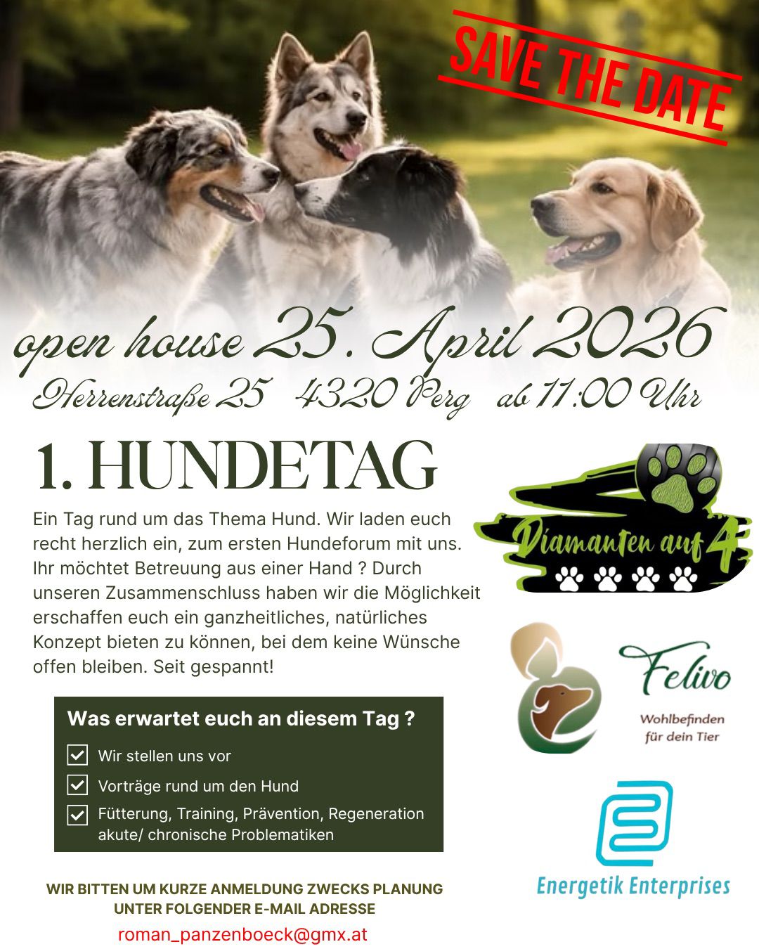 Was erwartet euch an diesem Tag ? Wir stellen uns vor ∑∑ Vorträge rund um den Hund Fütterung, Training, Prävention, Regeneration akute/ chronische Problematiken WIR BITTEN UM KURZE ANMELDUNG ZWECKS PLANUNG UNTER FOLGENDER E-MAIL ADRESSE roman_panzenboeck@gmx.at